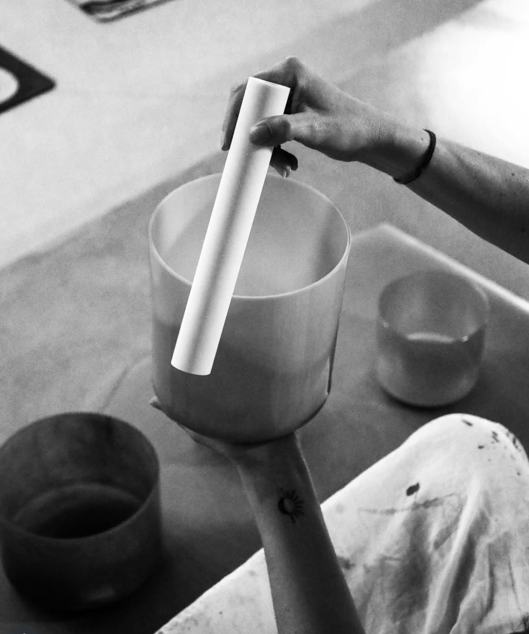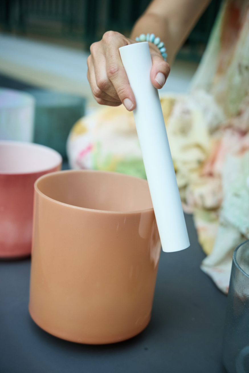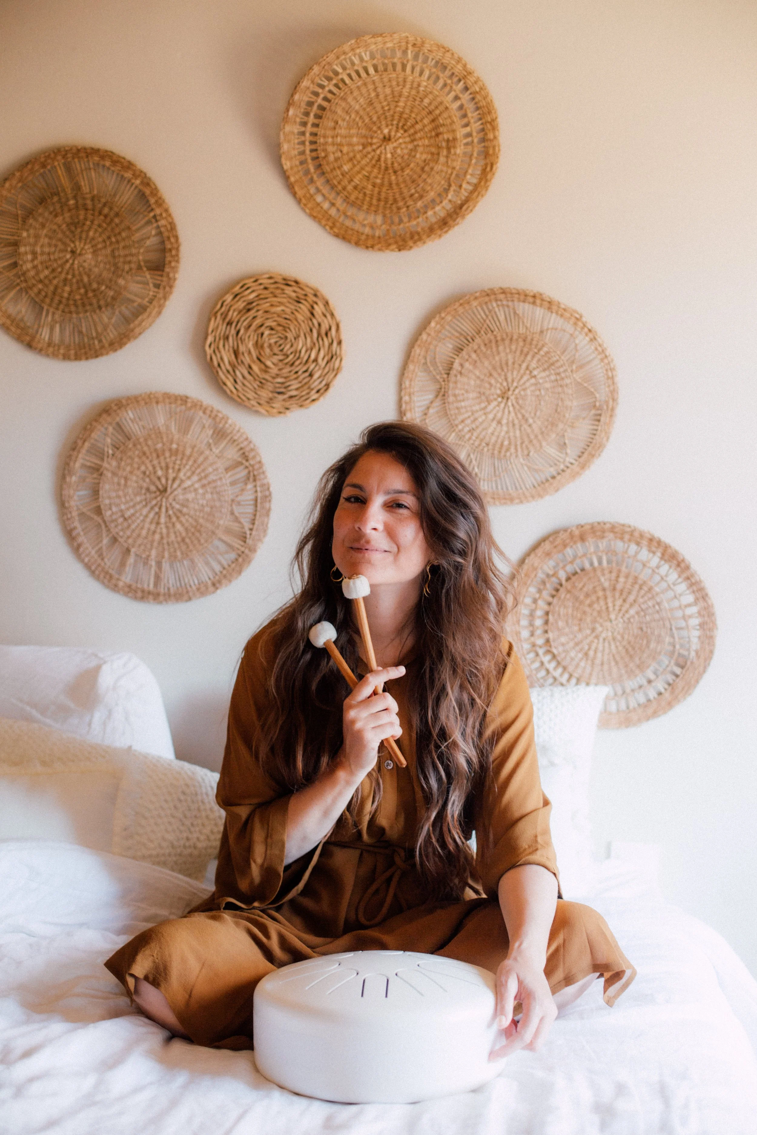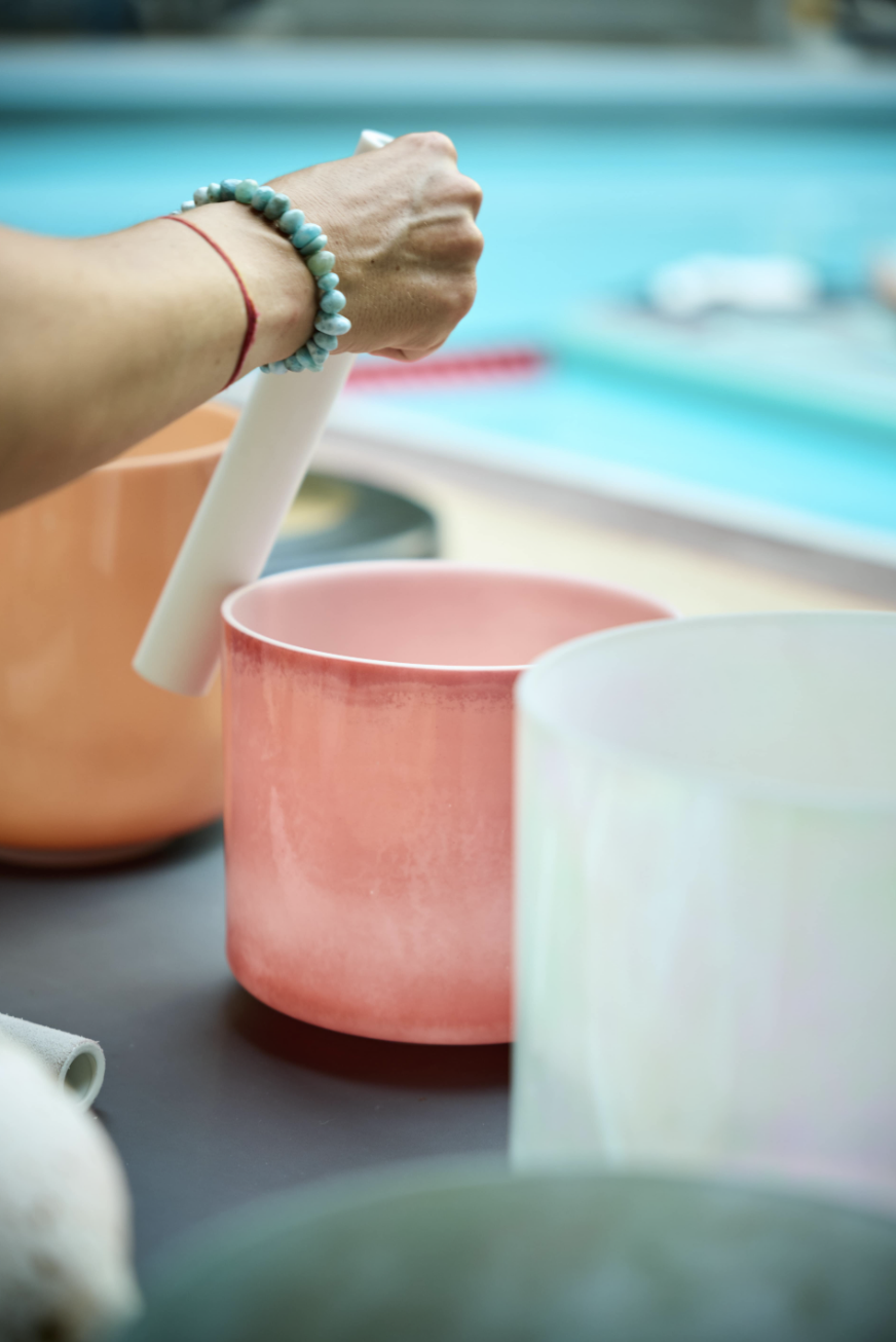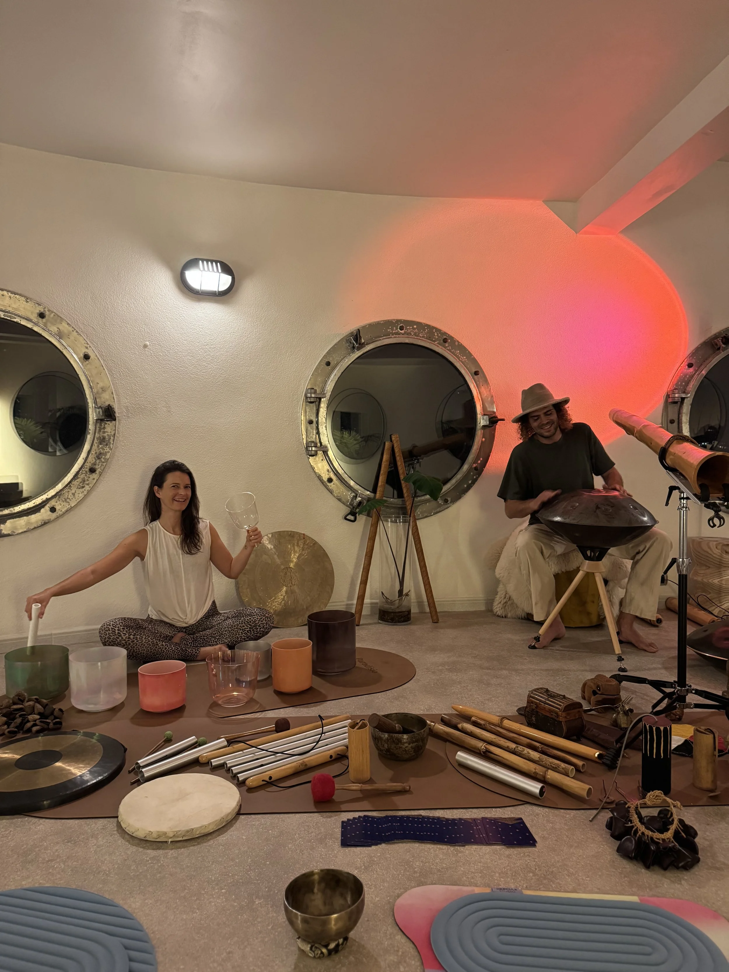 Également formée en sonothérapie, elle intègre à ses pratiques les bols de cristal, diapasons, gongs et instruments du monde, pour proposer des expériences immersives et transformatrices de voyages sonores.